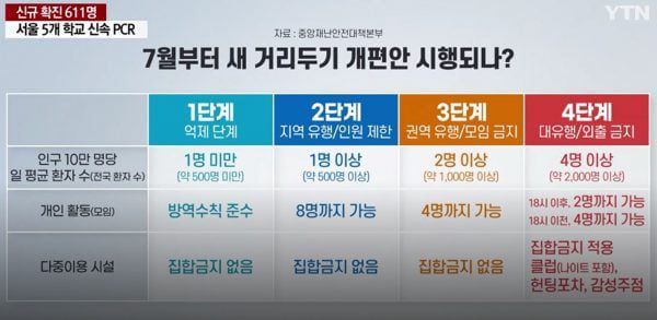 7월 1일부터 새로운 ‘사회적 거리 두기’ 개편안이 적용되면, 현행 5단계가 4단계로 줄어들고 집합 금지를 최소화하는 등 방역통제가 완화된다.